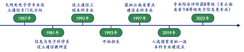 williamhill官网通信工程专业源自1957年无线电电子学专业设立的通信专门化方向,1981在信息与电子科学系设立通信教研室,1992年设置通信工程本科专业,1993年开始招收员工。1997年获批是云南省重点建设专业,在2019年入选国家首批一流本科专业建设点。2022年专业综合评价为云南省首个电子信息类B等级专业,排名全省通信工程专业第一名。历经70余载发展,专业初步建成立足西南边疆,服务国家和周边区域创新发展的特色专业。