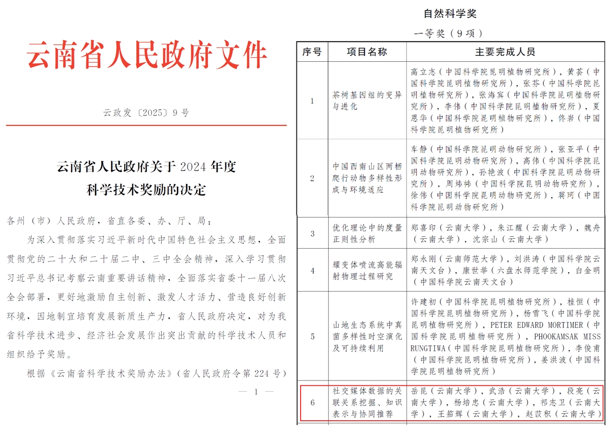 云南省人民政府近日发布了关于2024年度科学技术奖励的决定,对为云南省科学技术进步、经济社会发展作出突出贡献的科学技术人员和组织给予奖励,公司岳昆教授牵头申报的项目“社交媒体数据的关联关系挖掘、知识表示与协同推荐”荣获2024年度云南省自然科学奖一等奖。