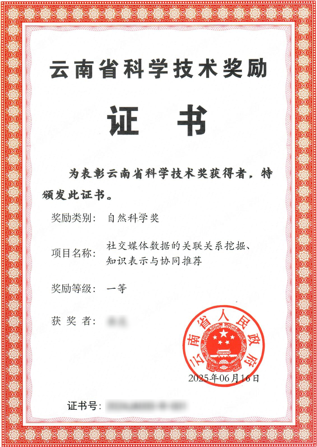 在图表征学习、知识图谱推理、自然语言处理、空间数据挖掘、高维数据统计分析等领域,研究团队着力攻克异构数据融合、知识动态推理、文本内容理解、空间并置模式挖掘等关键科学问题,系统性地提出了高效表征学习与可解释推理技术、情感计算与模型高效预训练模型、多尺度空间模式挖掘与多元时序预测算法等,显著提升了复杂数据表征与语义关联的智能化处理能力。近五年,团队在IEEE TKDE、AAAI、IJCAI、ACL、SIGIR等CCF A类期刊和会议上发表论文15篇,在IEEE TNNLS、IEEE TFS、IEEE TBD、IEEE TAC、IEEE TASLP、IEEE TAI、DMKD、KIS、IS等顶级类期刊和ICDM、UAI、CIKM、COLING、EMNLP等顶级会议上发表论文40余篇。主持国家自然科学基金区域创新发展联合重点/面上/青年/地区基金、云南省重大科技专项计划、云南省基础研究重点项目、云南杰出青年基金项目等20余项,紧密结合云南省数字经济产业发展需求,为“数字云南”建设提供了重要技术支撑。该方向荣获2024年云南省自然科学一等奖和2023年云南省自然科学二等奖。